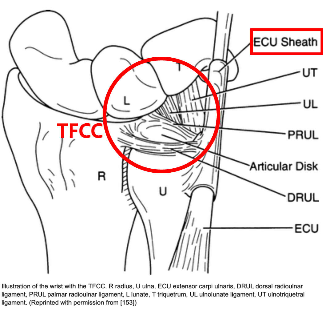손목 관절은 노뼈와 자뼈 그리고 손목뼈가 만나면서 이루어집니다. 이때 손목의 바깥쪽 뼈(자뼈)와 손목뼈들 사이의 삼각형 구조들을 총칭하는 말입니다. 말 그대로 삼각형으로 이루어진 섬유조직 들와 연골들의 복합체라고 볼 수 있습니다.